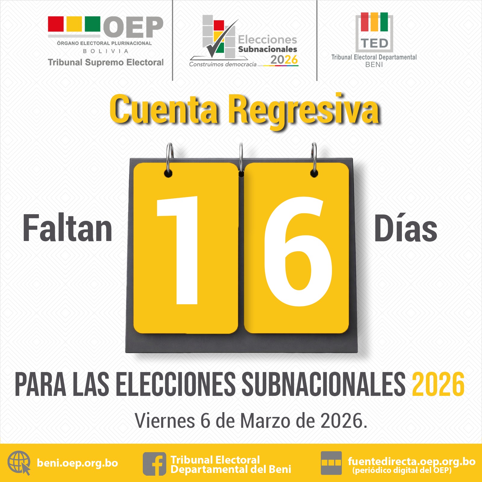 El Tribunal Electoral Departamental (TED) del Beni, contnua el despliegue de brigadas y maletas electorales hacia distintas rutas del departamento, en el marco del calendario establecido para la Segunda Vuelta de las Elecciones Subnacionales 2026. La movilización...